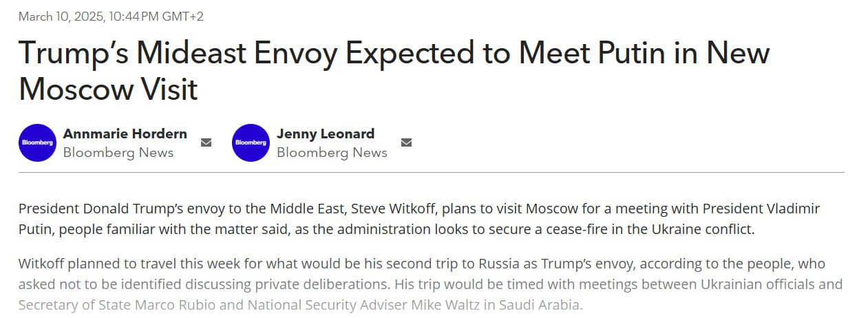 Напомним, что Уиткофф уже встречался с Путиным в Москве в феврале, когда обсуждал обмен заключенными.