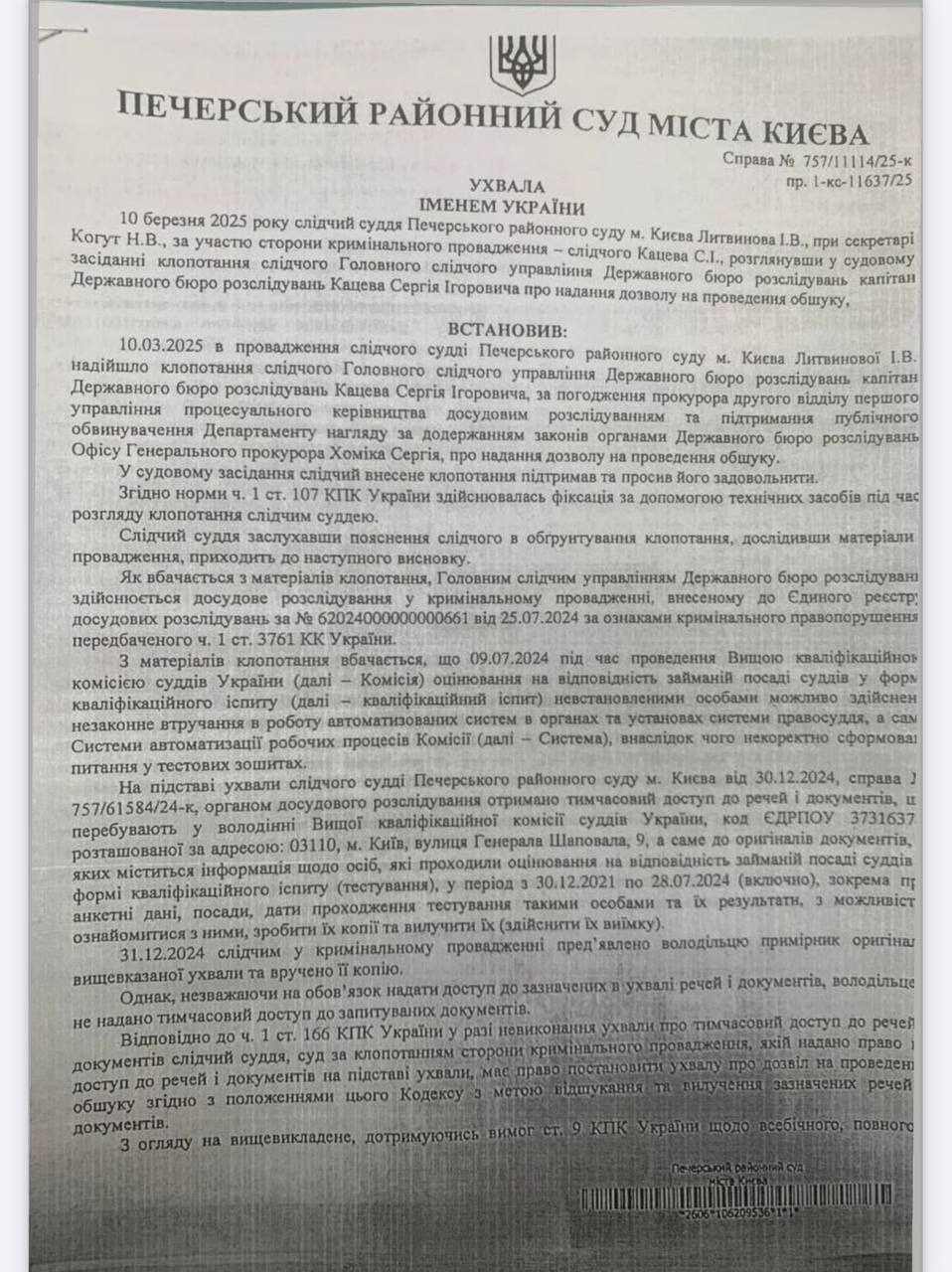 Ранее следователи уже получали временный доступ к документам, связанным с тестированием судей в 2021–2024 годах, однако не смогли их изъять. Поэтому суд дал разрешение на обыск, чтобы обнаружить и изъять документы и другие материалы, имеющие значение для расследования.