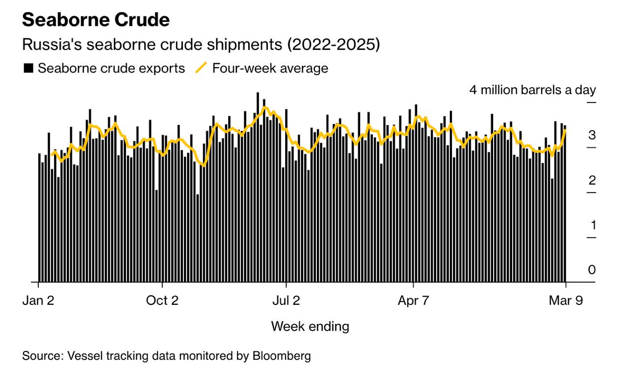 При этом потоки сырой нефти из всех российских портов за четыре недели по состоянию на 9 марта выросли примерно на 300 000 баррелей в день — самый большой прирост с января 2023 года — до 3,37 миллиона, самого высокого показателя с периода по 10 ноября.