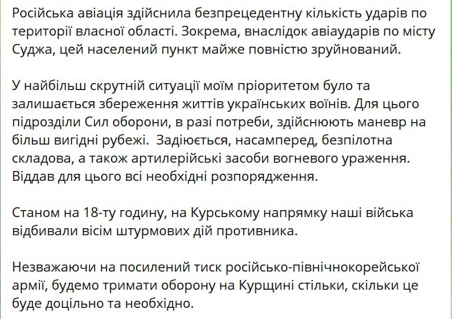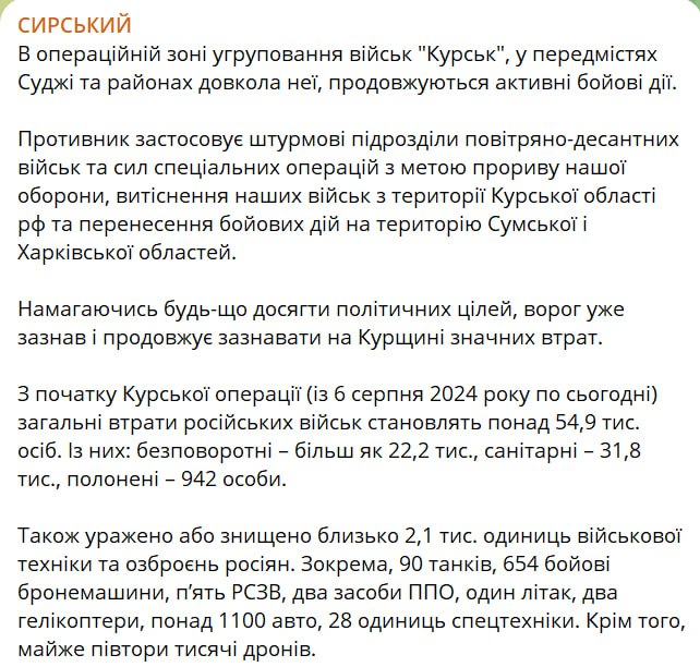 При этом Сырский говорит, что ВСУ будут "держать оборону в Курской области столько, сколько это будет целесообразно и необходимо".