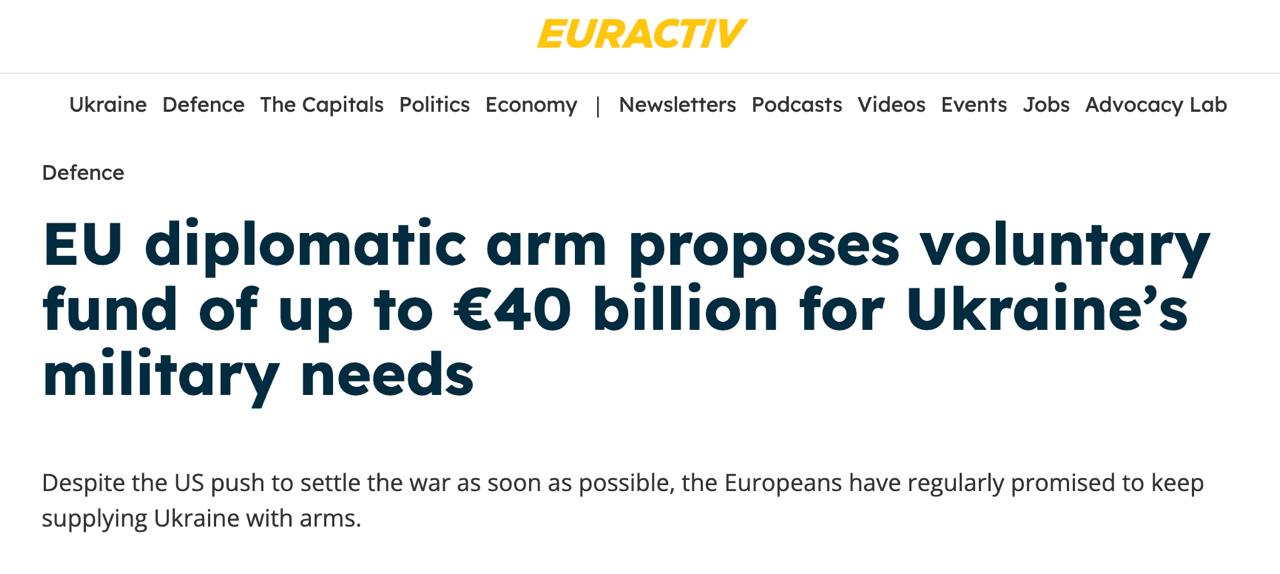 Евросоюз рекомендует странам блока добровольно оказать Украине в этом году 20-40 млрд евро военной помощи, создав специальный фонд.