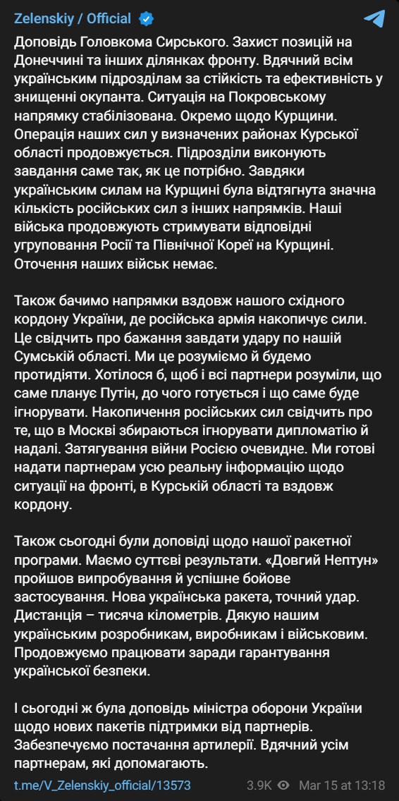 В субботу, 15 марта, в Украине идет 1116-й день войны с Россией.