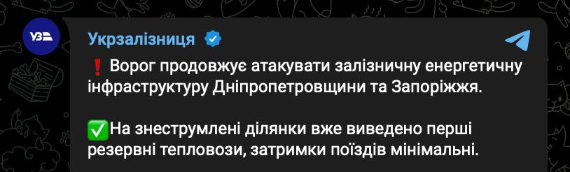 08:16 Ночью РФ нанесла удары по энергетике "Укрзализныци", сообщила компания.
