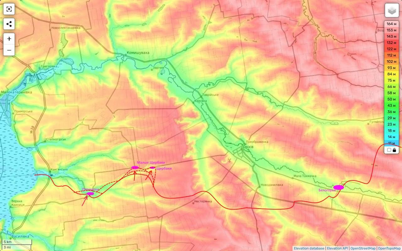 На днях телеграм-каналы РФ сообщали о захвате села Пятихатки к западу от Орехова. А сейчас они утверждают, что войска РФ прорвались также в соседние деревни Щербаки и Малые Щербаки. Предполагается, что это попытка обойти Орехов с запада и гипотетически - нарушить логистику ВСУ на этом направлении.