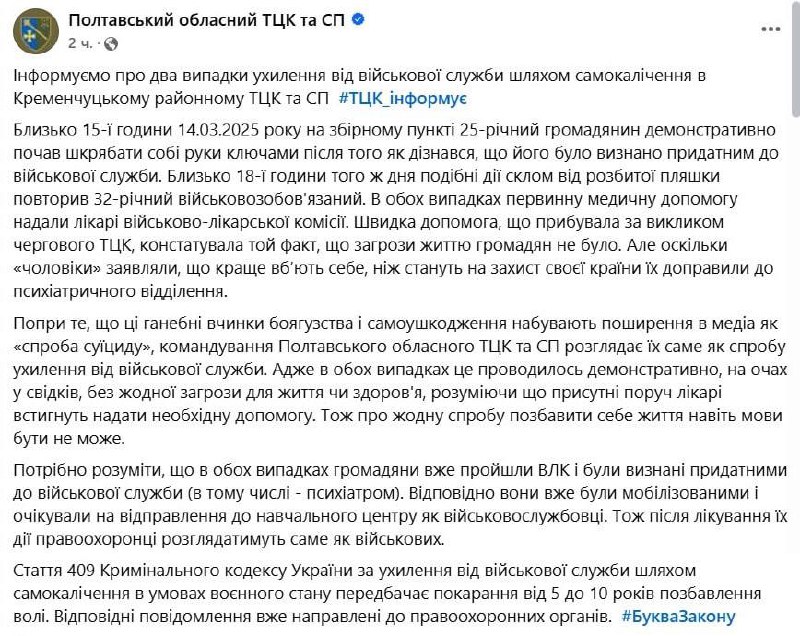 "Позорные поступки трусости и самоповреждения получают распространение в медиа как "попытка суицида", командование Полтавского областного ТЦК и СП рассматривает их как попытку уклонения от военной службы", - пишет ТЦК.