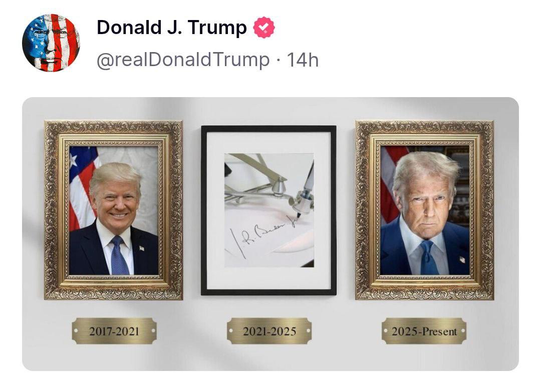 На своей странице в собственной социальной сети Truth Трамп опубликовал изображение, где на президентском фото Байдена изображен не портрет, а устройство для подписи.