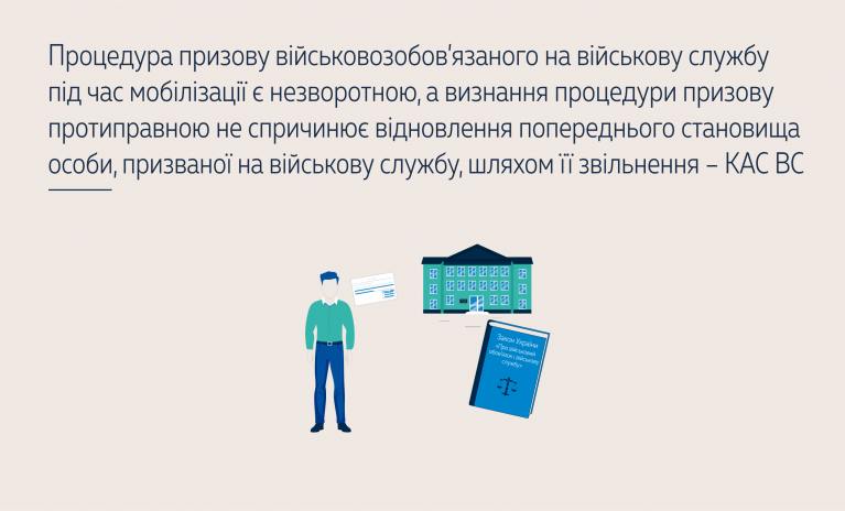Верховный суд подчеркнул, что призыв на военную службу во время мобилизации является необратимым, то есть уже состоявшимся, а признание процедуры призыва противоправной не влечет возобновления предыдущего положения лица, призванного на военную службу. Факт же непрохождения медицинского осмотра во время призыва не является свидетельством непригодности истца к военной службе и основанием для увольнения с нее.