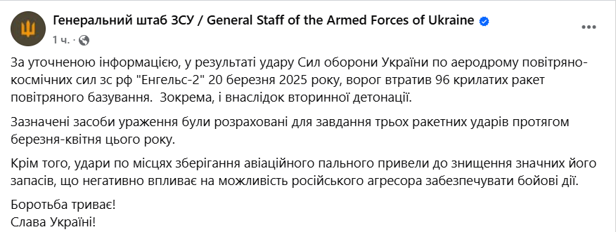 "25-27 марта Силы обороны Украины не наносили удары БпЛА по энергетическим объектам России в Курской и Брянской областях России, а также по энергетическим объектам на территории временно оккупированного россиянами украинского Крыма", - заявляет Генштаб.
