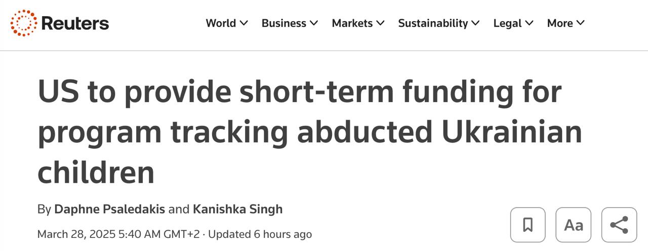 12:06 Госдеп США сообщил, что ненадолго продлил финансирование программы по отслеживанию вывезенных в Россию украинских детей, которая ранее была заморожена, передает Reuters.