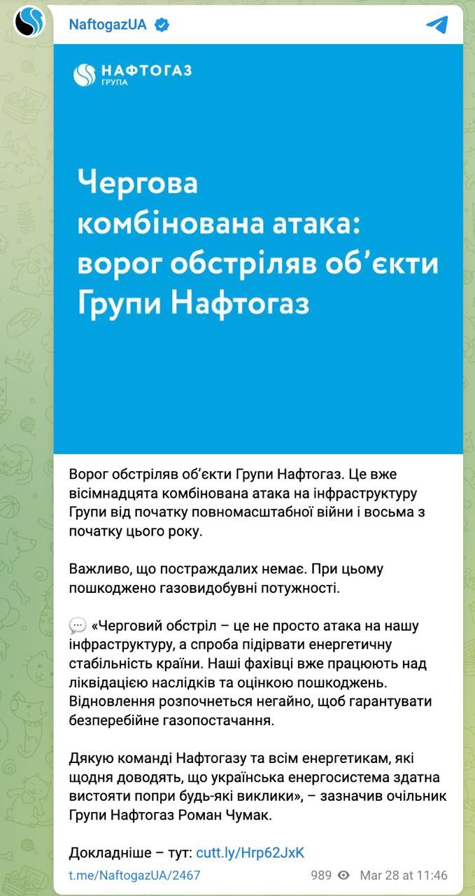 12:39 "Нафтогаз" заявил о повреждении обстрелом своих газодобывающих мощностей, что нарушает "энергетическое перемирие".