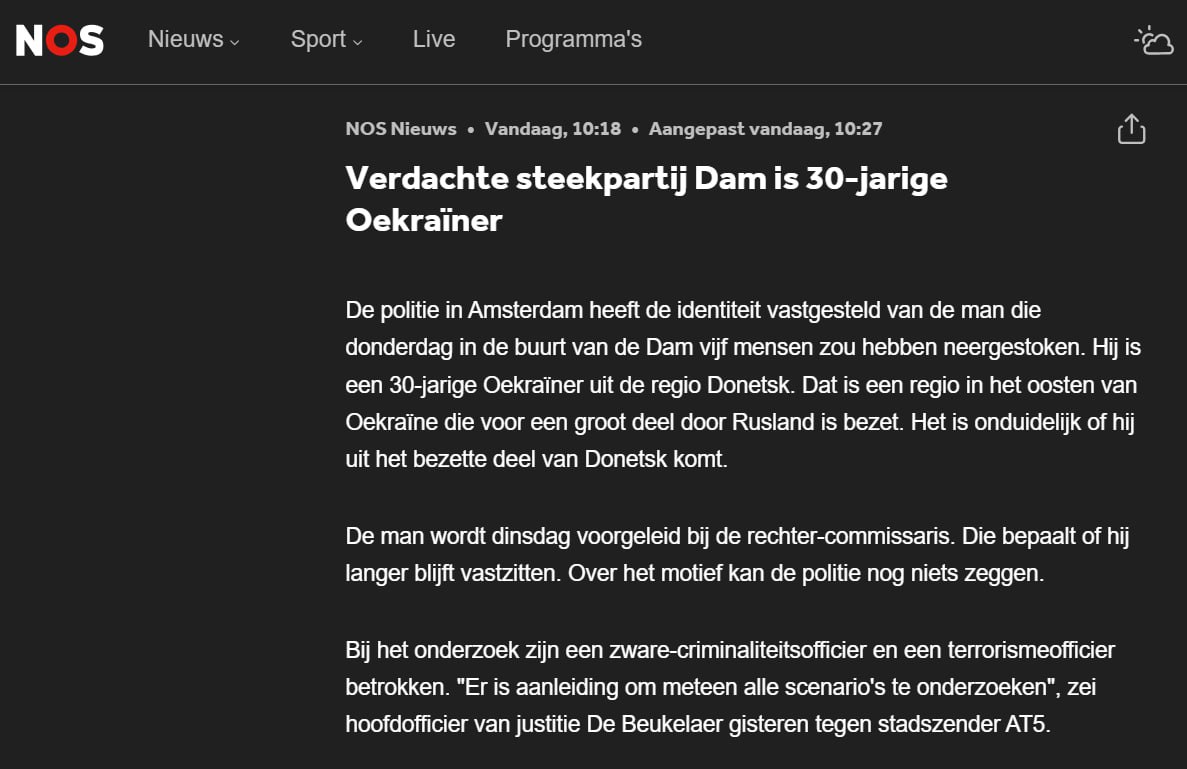 "Полиция Амстердама установила личность мужчины, который предположительно в четверг нанес ножевые ранения пятерым людям недалеко от площади Дам", - пишет издание.