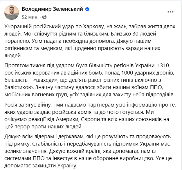 15:08 Украина ожидает реакции США и Европы на удары России, заявил Зеленский.