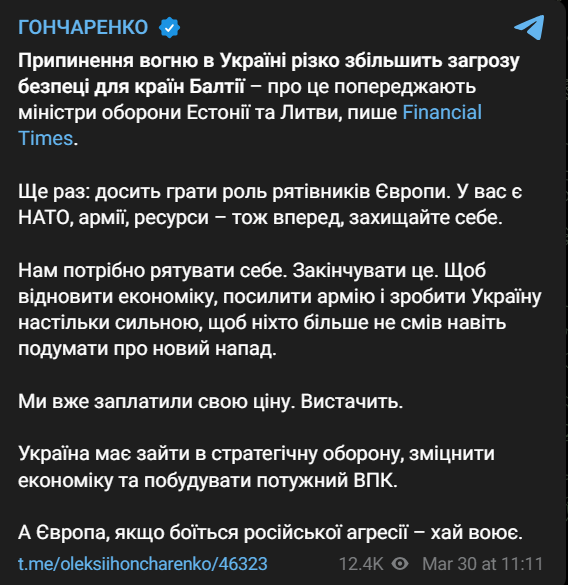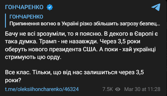"Еще раз: достаточно играть роль спасателей Европы. У вас есть НАТО, армии, ресурсы – так что вперед, защищайте себя. Нам нужно спасать себя. Кончать это. Чтобы восстановить экономику, усилить армию и сделать Украину настолько сильной, чтобы никто не смел даже подумать о новом нападении. Мы уже заплатили свою цену. Хватит. Украина должна войти в стратегическую оборону, укрепить экономику и построить мощный ВПК. А Европа, если боится российской агрессии, пусть воюет. У некоторых в Европе есть такое мнение. Трамп – не навсегда. Через 3,5 года изберут нового президента США. А пока – пусть украинцы сдерживают эту орду. Все класс. Только что от нас останется через 3,5 года?", - написал Гончаренко.