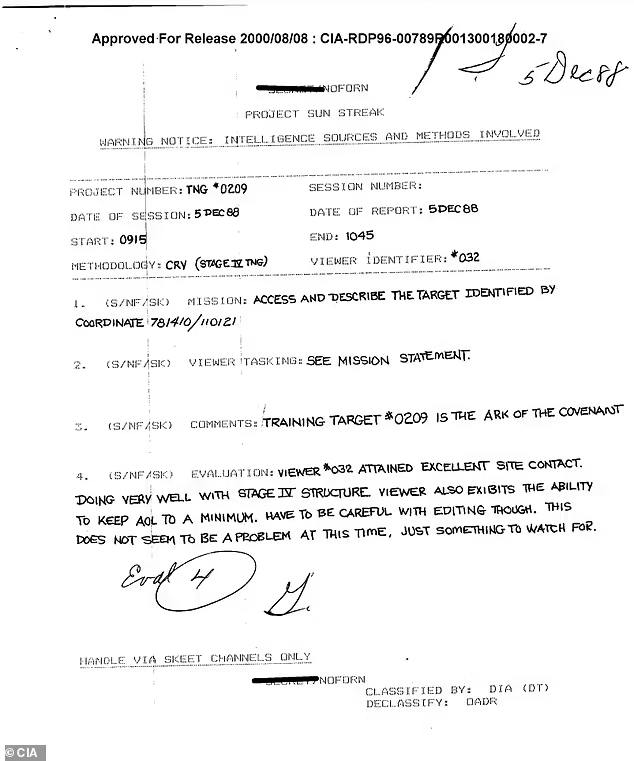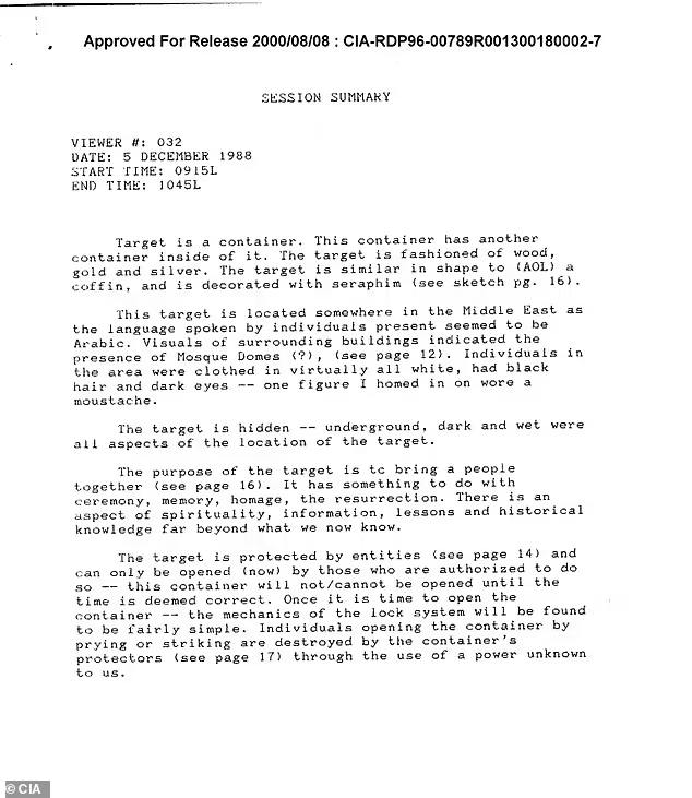 Как описано в отчете разведуправления от 5 декабря 1988 года, перед одним из медиумов под №032 поставили задачу найти "определенный предмет", но не пояснили ему, что это ковчег Завета. Экстрасенс описал ковчег Завета как сундук, изготовленный из дерева, золота и серебра, с изображениями шести крылатых ангелов. По его словам, он находится "где-то на Ближнем Востоке".