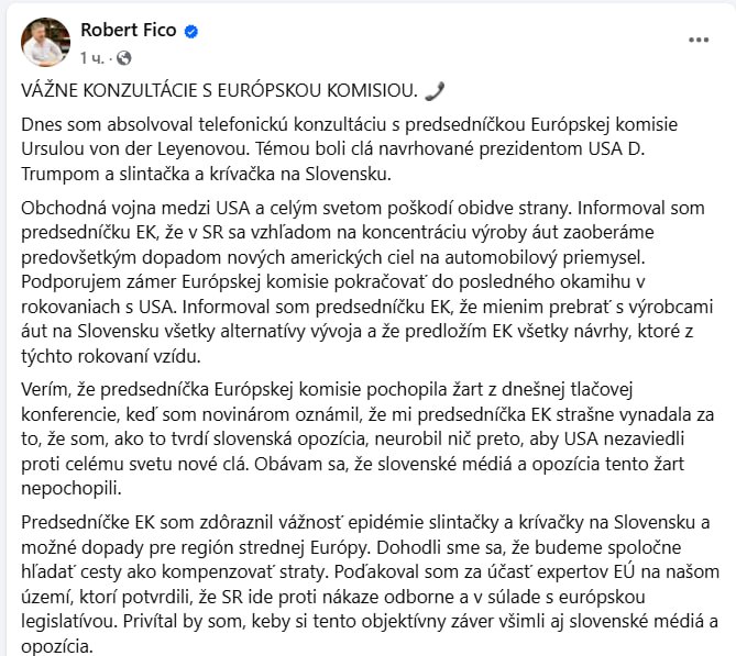 "Я надеюсь, что глава Еврокомиссии поняла шутку на сегодняшней пресс-конференции, когда я сказал журналистам, что глава ЕК ужасно ругала меня за то, что я не сделал ничего, как утверждает словацкая оппозиция, чтобы предотвратить введение новых американских тарифов против всего мира. Боюсь, что словацкие СМИ и оппозиция не поняли", – написал Фицо.