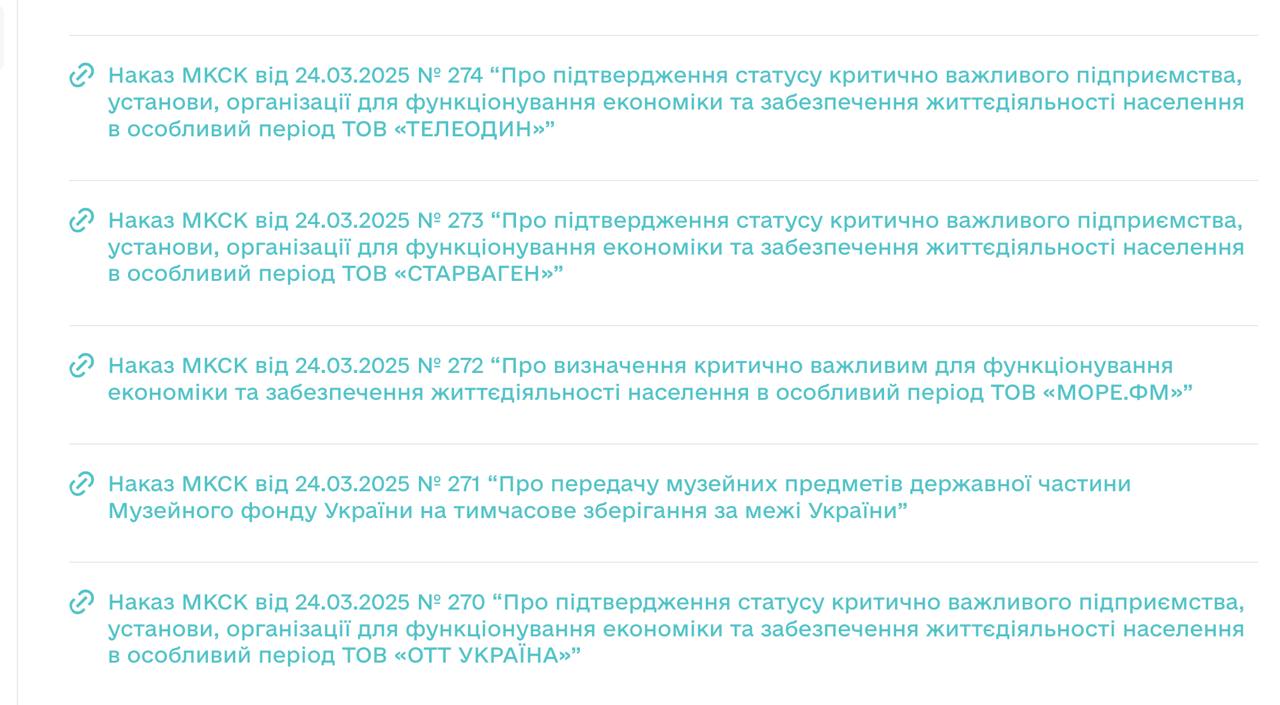 11:32 Минкульт продлил возможность бронировать сотрудников музыкальным телеканалам М1, М2, Суспильному (НСТУ), криворожскому ТРК "Рудана" и прикарпатскому изданию ПИК.