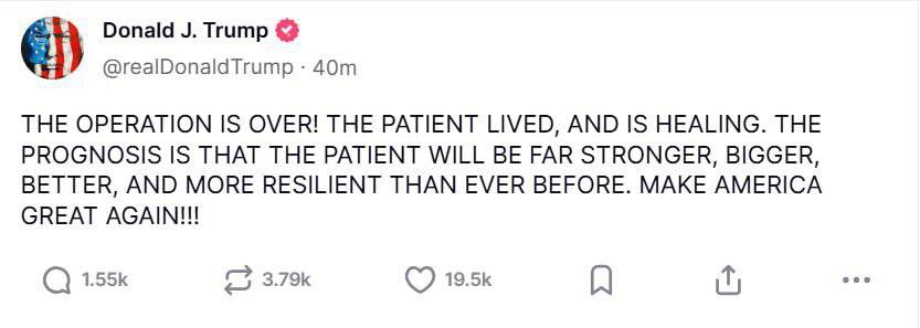 "Операция завершена! Пациент выжил и идет на поправку. Прогноз: пациент станет гораздо сильнее, больше, лучше и выносливее, чем когда-либо. Сделаем Америку великой снова!" - написал президент США в своей соцсети.