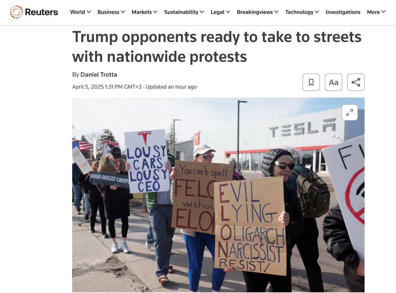 По ожиданиям организаторов, митинги станут "крупнейшим днем ​​протеста против президента Дональда Трампа и его союзника-миллиардера Илона Маска с тех пор, как администрация начала свои стремительные усилия по наложению консервативного штампа на правительство".