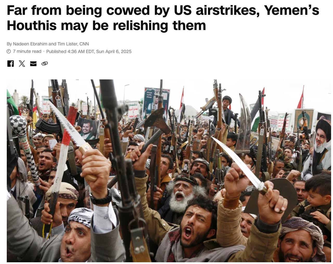 По мнению аналитиков, были убиты до 80 офицеров хуситов, но высший эшелон военного и политического руководства выглядит невредимым, как и многие из ракетных пусковых площадок. С середины марта хуситы запустили дюжину баллистических ракет по Израилю, а также обрушили шквал беспилотников и ракет на корабли ВМС США.