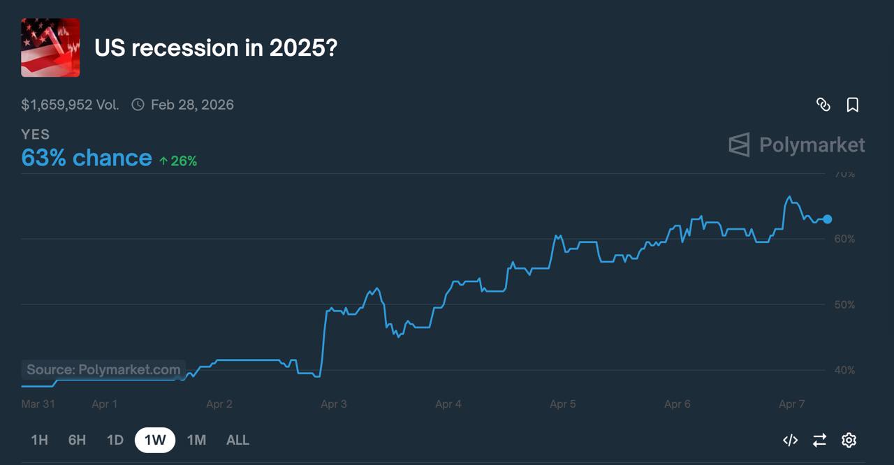 Как сообщает Reuters, банк Goldman Sachs повысил вероятность рецессии в США с 35% до 45%. А платформа биржевых прогнозов Polymarket оценивает вероятность рецессии в США в этом году на уровне 63%. Причем этот показатель резко пошел в рост с 3 апреля - после объявления Трампа о новых тарифах. Накануне риск оценивался в 40%.