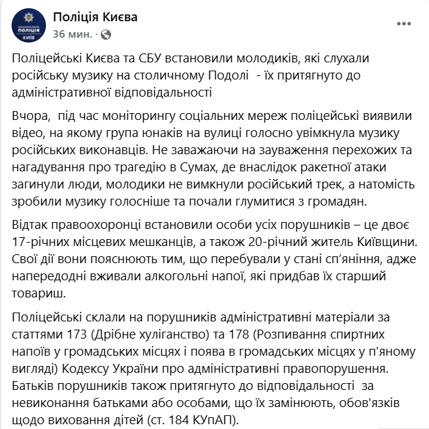 "Не обращая внимания на замечания прохожих и напоминания о трагедии в Сумах, где в результате ракетной атаки погибли люди, молодые люди не выключили российский трек, а сделали музыку громче и начали глумиться над гражданами", - говорится в сообщении.