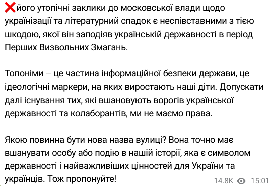 Глава Львовской областной военной администрации Максим Козицкий предлагает переименовать улицу во Львове, названную в честь первого премьер-министра Украинской народной республики Владимира Винниченко.