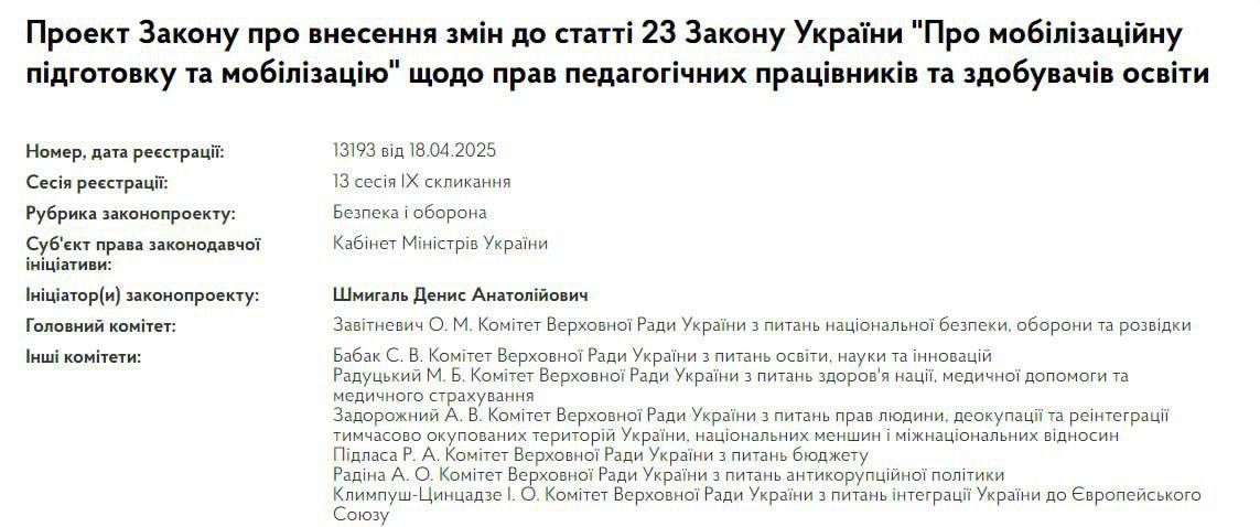 Кабинет министров внес в Верховную Раду проект закона №13193, который лишит отсрочки от мобилизации получающих профессионально-техническое и профессиональное предвысшее образование старше 25 лет. Проект направлен на пресечение использования образования как способа уклонения от армии.