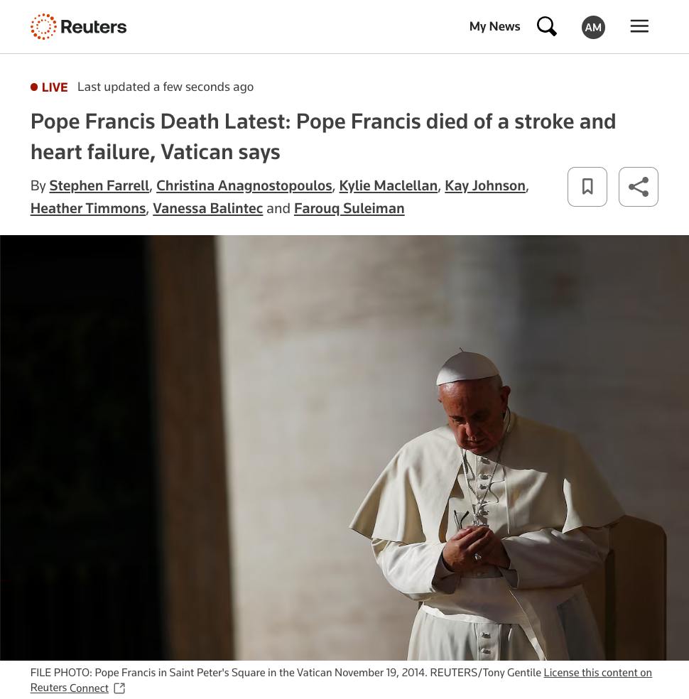 Напомним, папа римский Франциск умер сегодня утром. Ему было 88 лет.