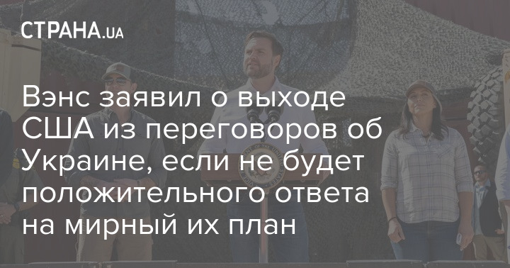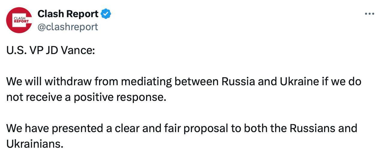Вице-президент США Джей Ди Вэнс заявил, что Вашингтон откажется от посредничества между РФ и Украиной, если не получит положительного ответа. Видимо, он имеет в виду ответ на американские условия установления мира, изложенные в опубликованном СМИ плане урегулирования конфликта.