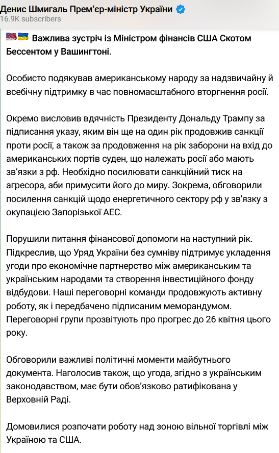О прогрессе сообщат до 26 апреля. Шмыгаль обсудил с министром финансов США сделку о недрах Украины