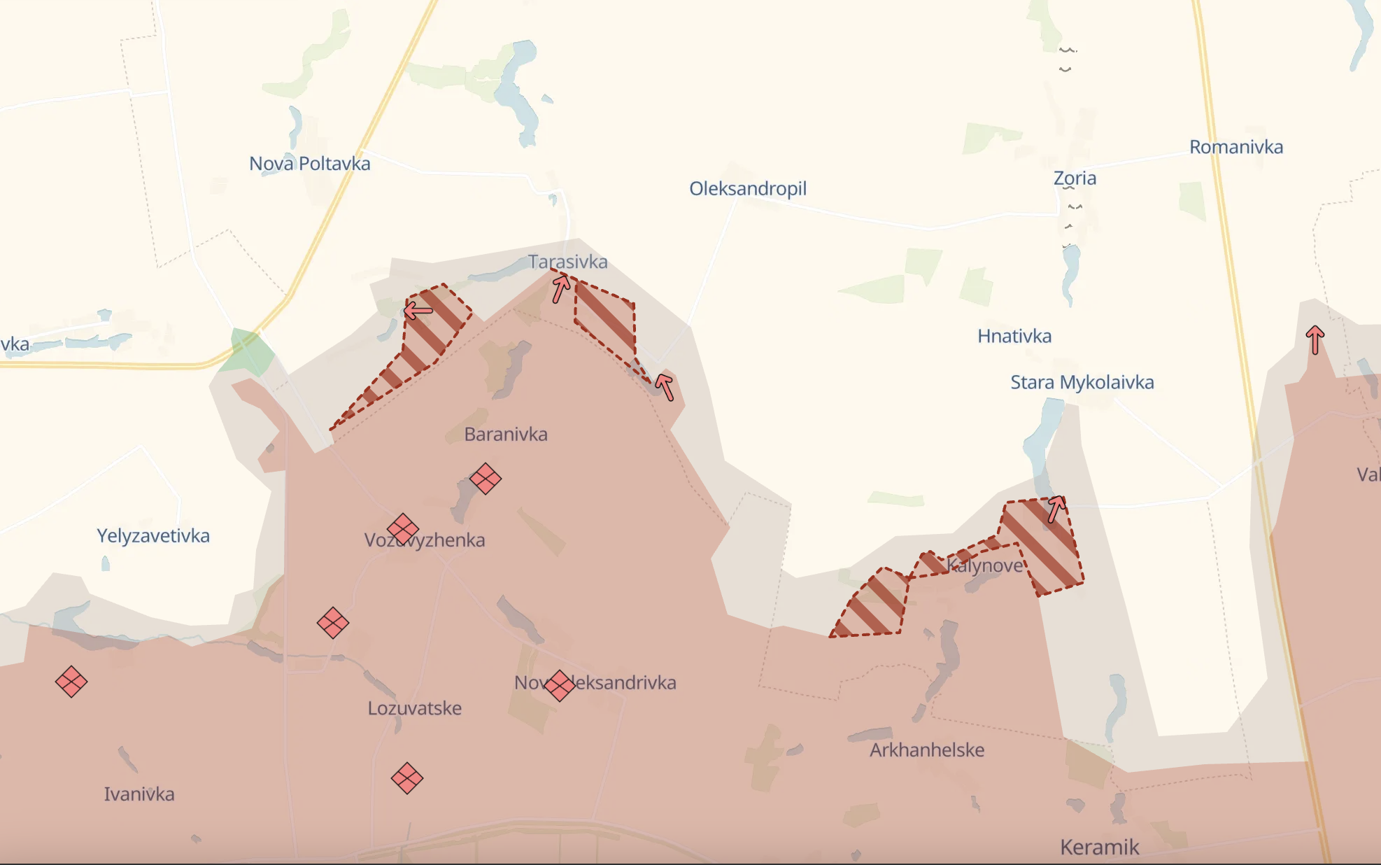 Российские войска продолжают продвигаться к югу от Константиновки. Они продвинулись в районе Калиновки и Тарасовки (Россия заявляет о полном захвате обоих сел).