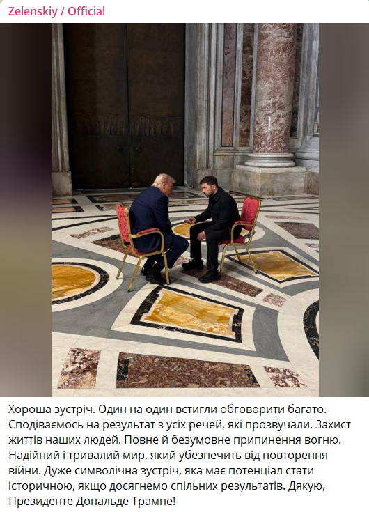 "Президенты встретились в Базилике Святого Петра, встреча продолжалась около 15 минут. Лидеры договорились продлить переговоры сегодня. Команды работают над организацией продолжения встречи", – рассказал спикер Зеленского Сергей Никифоров.