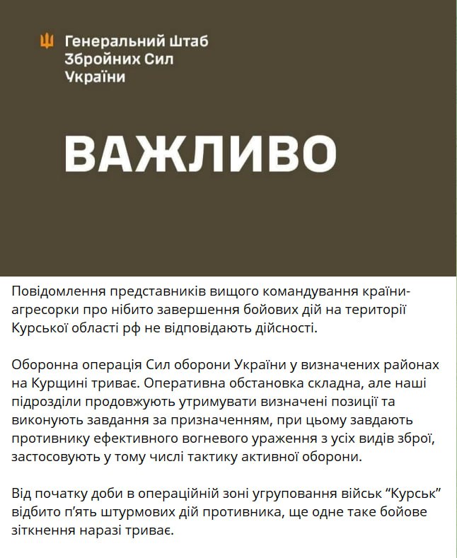 15:07 Генштаб ВСУ опровергает заявление Генштаба армии РФ о том, что россияне полностью взяли под контроль всю Курскую область.