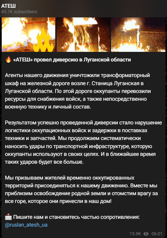 Партизаны совершили диверсию в Станице Луганской. Фото: "АТЕШ"