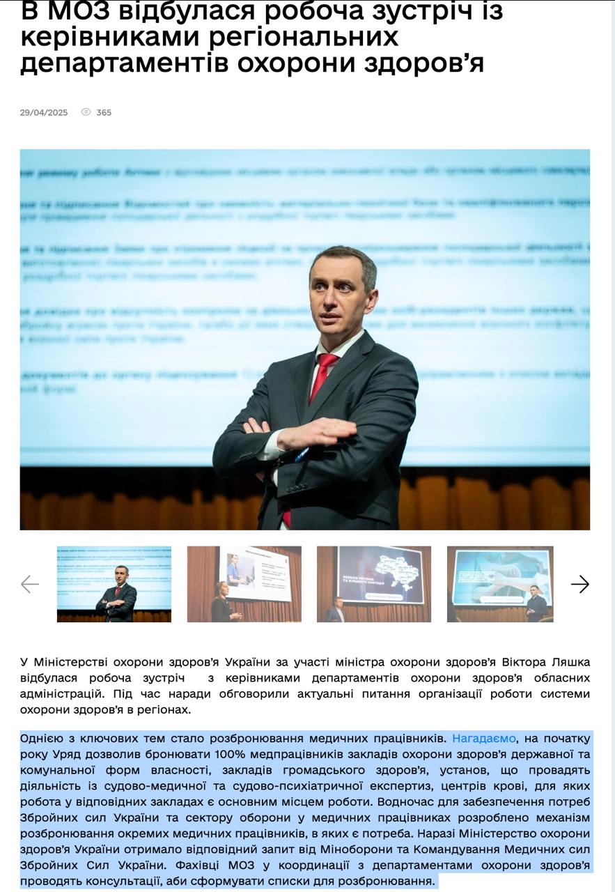 "Напомним, в начале года правительство разрешило бронировать 100% медработников учреждений здравоохранения государственной и коммунальной форм собственности, учреждений общественного здоровья, учреждений, осуществляющих деятельность по судебно-медицинской и судебно-психиатрической экспертизе, центрам крови, для которых работа в соответствующих учреждениях является основным местом работы. В то же время для обеспечения потребностей Вооруженных сил Украины и сектора обороны в медицинских работниках разработан механизм разбронирования отдельных медицинских работников, в которых есть потребность. Специалисты Минздрава в координации с департаментами здравоохранения проводят консультации с тем, чтобы сформировать списки для разбронирования", - сказано на сайте Минздрава.