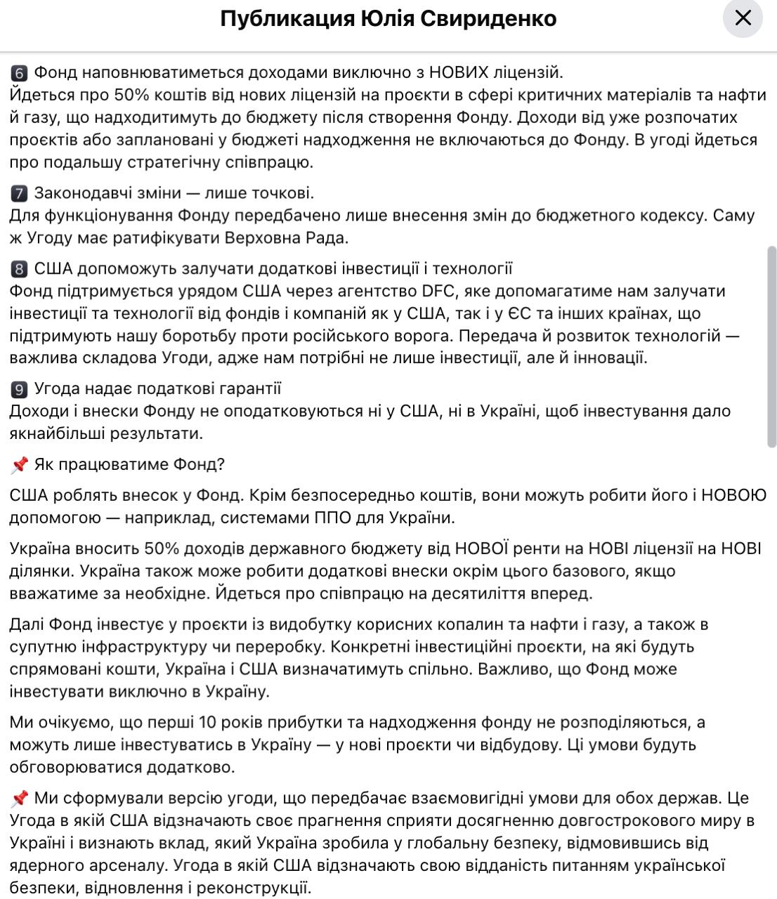 Министр экономики Юлия Свириденко заявила, что по этой сделке ресурсы останутся в собственности Украины. Совместный фонд создаётся на условиях 50/50. Ни одна из сторон не будет иметь преимущественного голоса.