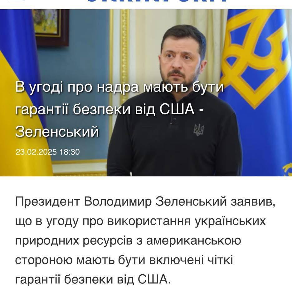Текст украинско-американской сделки о недрах ещё не опубликован. Но ни в одном комментарии по его поводу, ни от Украины, ни от США не упоминается наличие в соглашении гарантий безопасности Украины, на которых ранее настаивал президент Владимир Зеленский (смотрим скрин его заявления от 23 февраля).