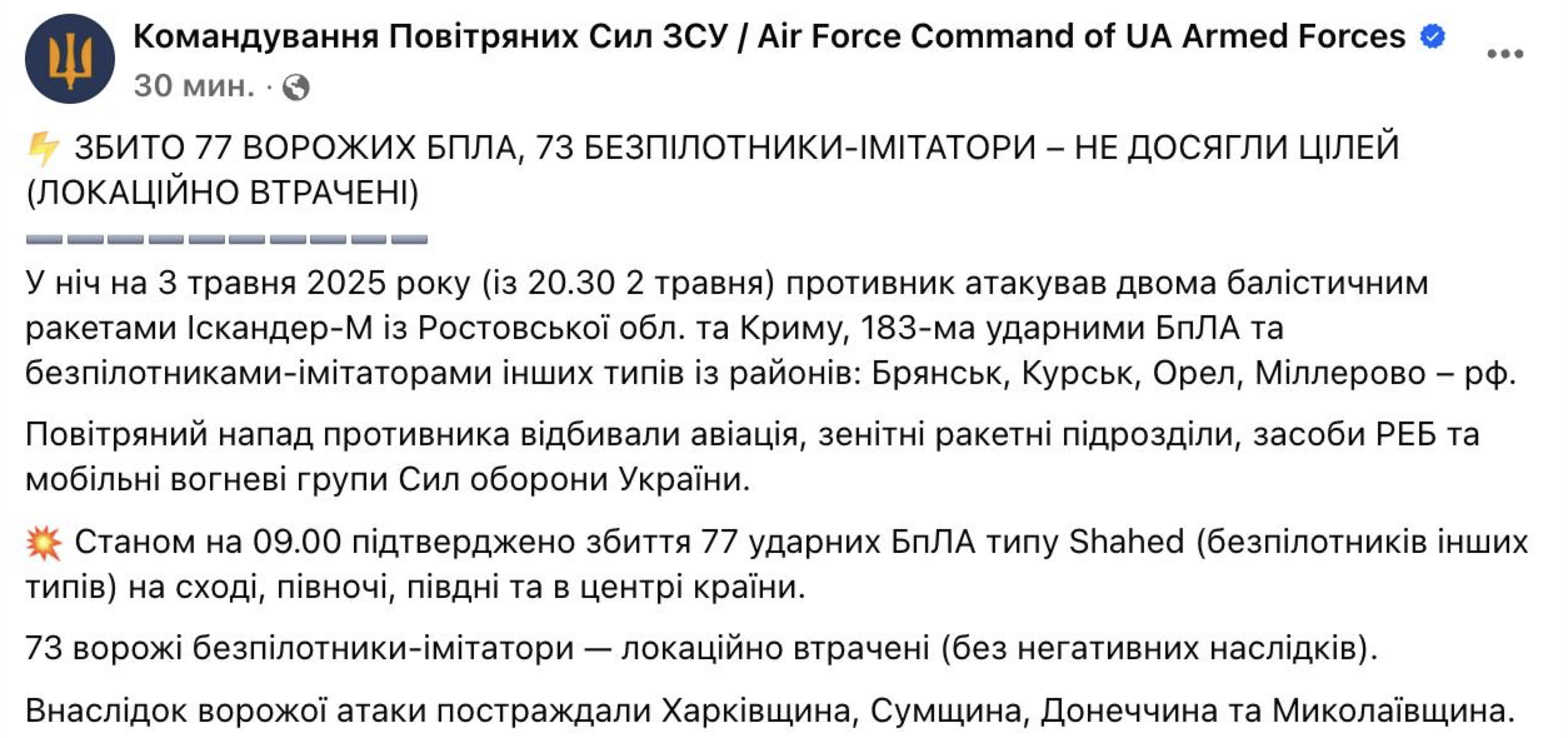 09:33 Россия ночью ударила по Украине двумя ракетами «Искандер» и 183 беспилотниками, сообщают ВСУ.