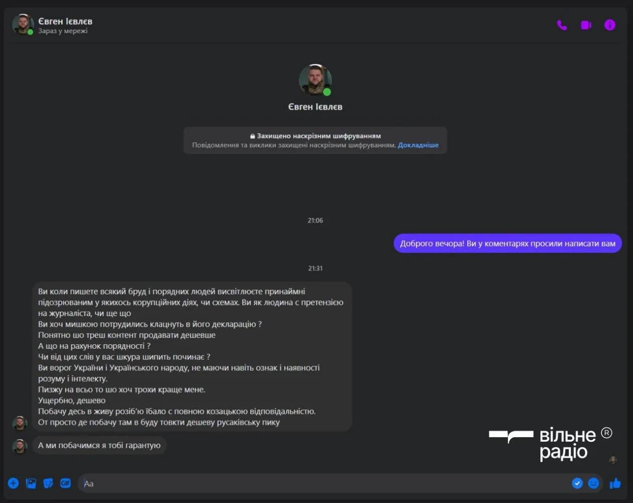 А позже журналист Евгений Вакуленко опубликовал переписку с сыном фигуранта материала, спикером Киевской городской военной администрации Евгением Иевлевым. Тот обвиняет журналиста в непрофессионализме, говорит, что он не изучил в полной мере декларацию, а напоследок угрожает насилием.