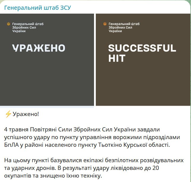 Воздушные силы Вооруженных сил Украины нанесли удар по пункту управления российскими подразделениями беспилотников в районе населенного пункта Теткино Курской области РФ.