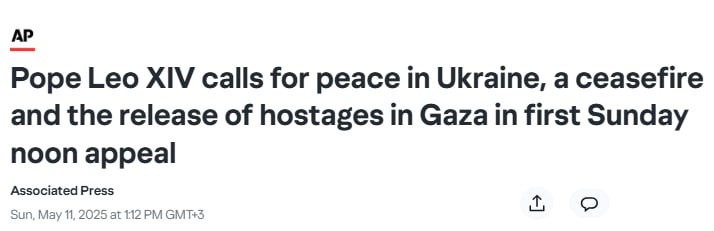 "В своем сердце я ношу страдания возлюбленного украинского народа. Да будет сделано все возможное, чтобы достичь как можно скорее подлинного, справедливого и продолжительного мира. Да будут освобождены все пленные и да вернутся к своим семьям и детям", - сказал Лев XIV.