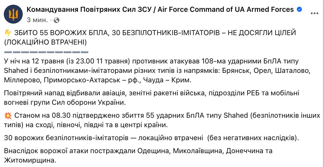 По Украине ночью запускались "Шахеды", в разных регионах страны звучали взрывы (Россия об аналогичных налетах со стороны Украины не заявляла). ВСУ говорят о налете 108 дронов разных типов. Пострадали Одесская, Николаевская, Донецкая и Житомирская области.