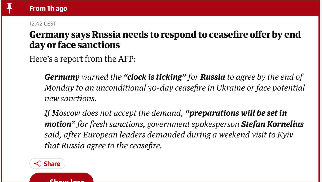 Он считает, что предложение Путина вместо перемирия возобновить переговоры с Украиной в Стамбуле "встретило понимание лидеров многих стран".