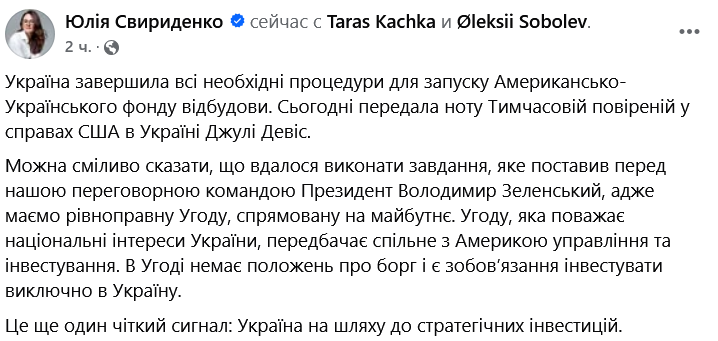 Об этом сообщила вице-премьер Украины Юлия Свириденко на своей странице в Фейсбуке.