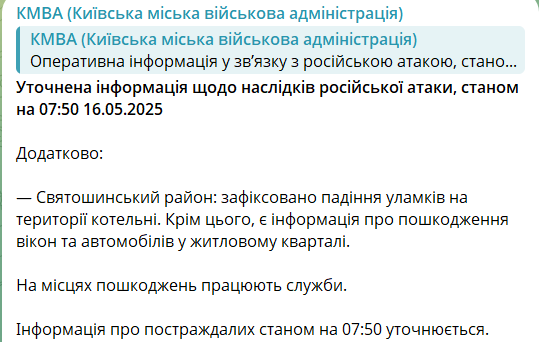 08:16 Киев с утра атаковали дроны. В КГВА сообщают, что зафиксировано падение обломков на территории котельной в Святошинском районе. Кроме того, есть информация о повреждениях окон и автомобилей в жилом квартале.