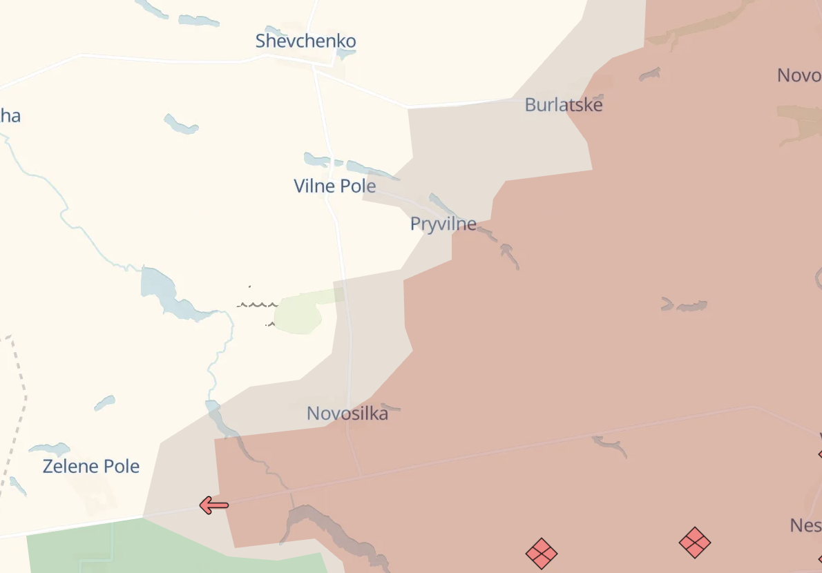 К западу от Великой Новоселки россияне, как заявляет минобороны РФ, захватили село Вольное Поле. Украина этого не подтверждала. По картам Deep State, лишь восточная часть деревни находится в "серой зоне".