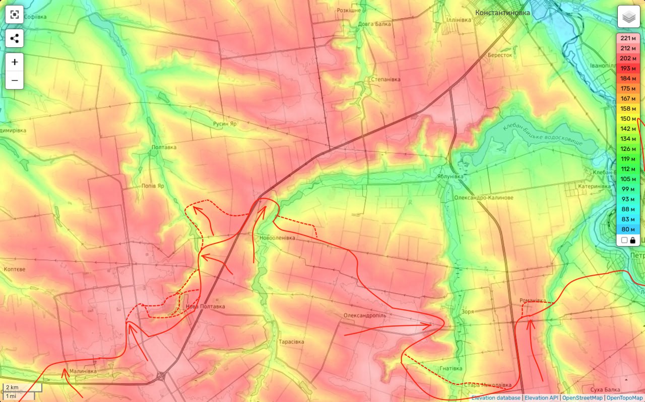 Со стороны Новой Полтавки россияне уже наступают к северу от трассы Покровск - Константиновка, которая, по сути, уже окончательно перерезана.