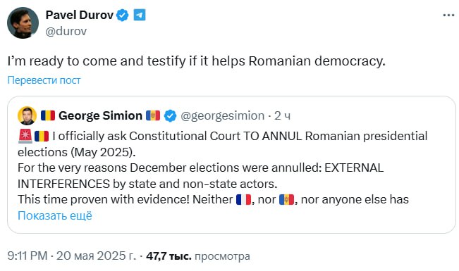 "Я готов приехать и дать показания, если это поможет румынской демократии", – написал Дуров.