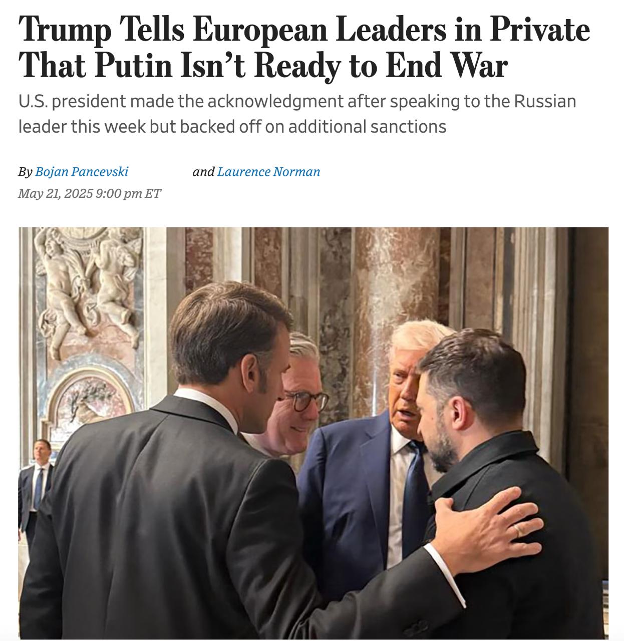 Трамп сказал европейским лидерам, что "Путин не готов закончить войну, потому что думает, что побеждает". Ранее Bloomberg давал иную цитату - что сам Трамп был убежден в победе РФ.