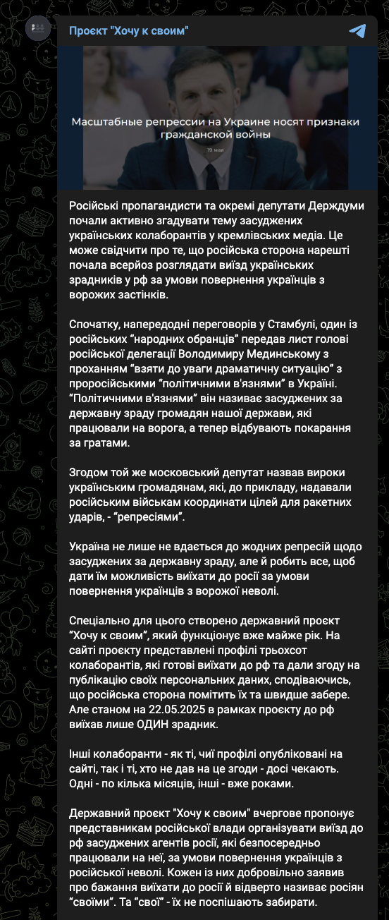 Также проект сегодня опубликовал сообщение, где рассказал, что РФ на переговорах в Стамбуле поднимала вопрос этой категории украинских заключенных, называя их "жертвами репрессий". Но шла ли речь о предложении обменять этих людей или же о требовании к Украине их освободить, не уточнялось.